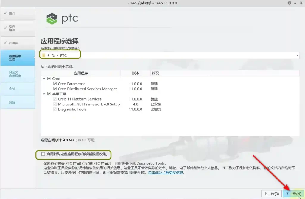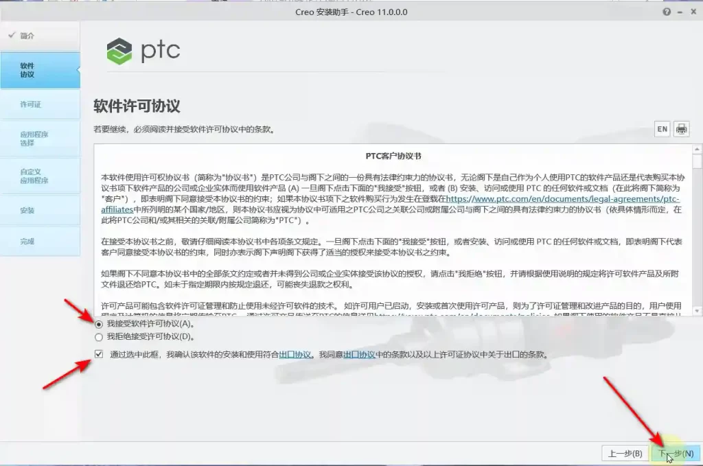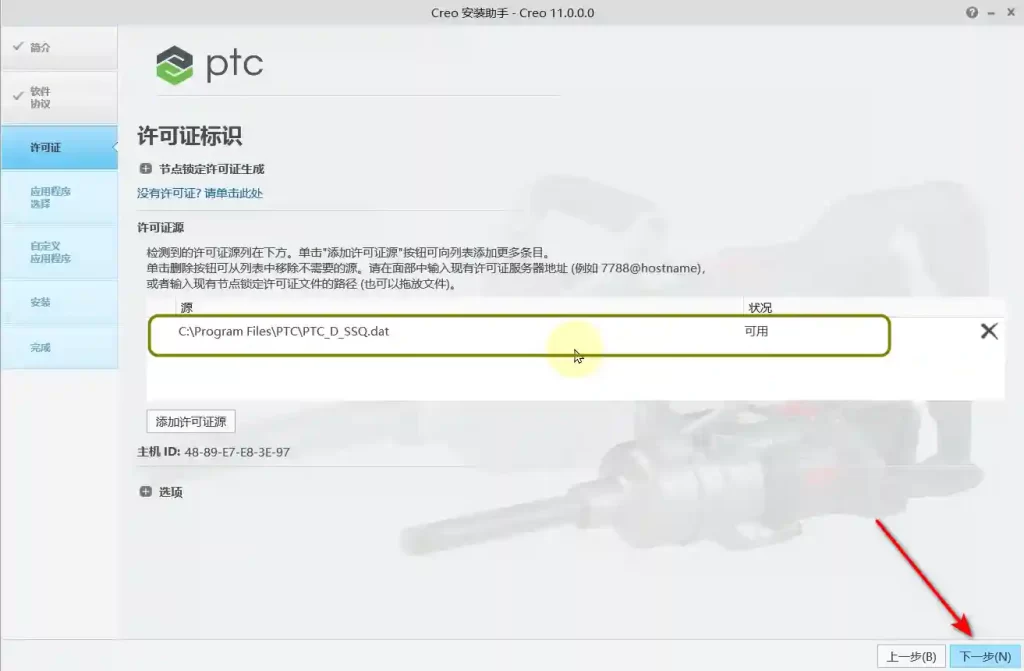 11、软件会自动识别许可证(如果没有识别,将之前(第4步)生成的“PTC_D_SSQ.dat”文件拖动到许可证位置),状况处显示”可用“,说明没有任何问题,直接点击”下一步”