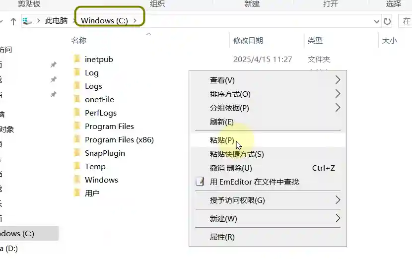 3、粘贴到c盘如图所示(若提示需要权限勾选“为所有当前项目执行此操作)点击继续