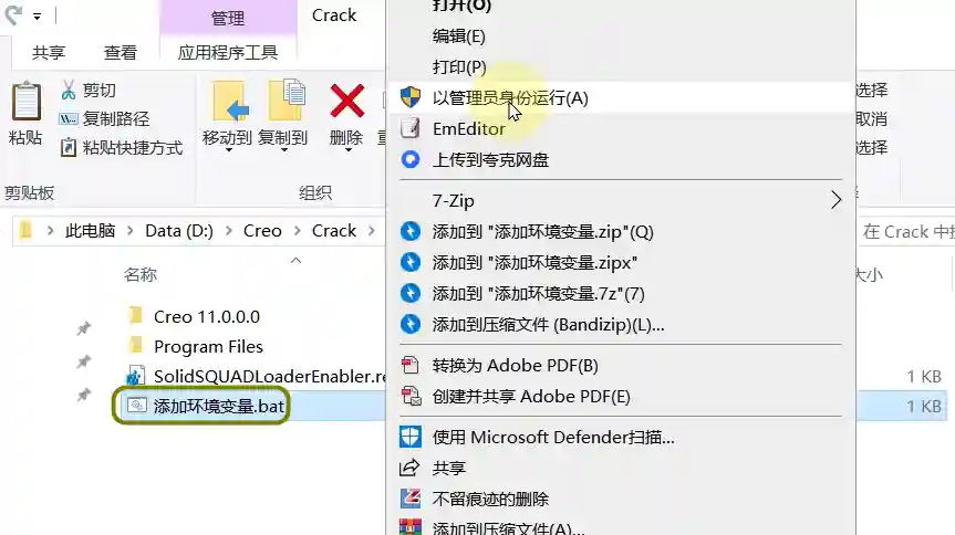 6、继续打开Crack文件夹选中 添加环境变量.bat 以管理员运行(黑框一闪而过不用管)
