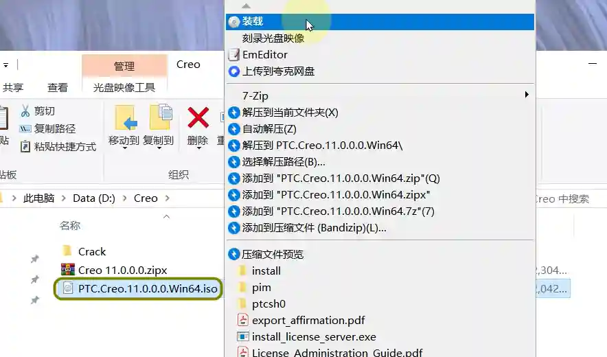 7、返回解压出来的文件夹找到PTC.Creo.11.0.0.0.Win64.iso点击装载