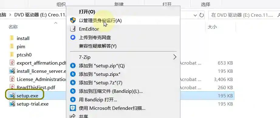 8、在DVD驱动器(E)找到setup.exe 右键以管理员运行