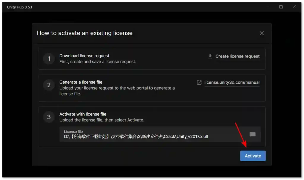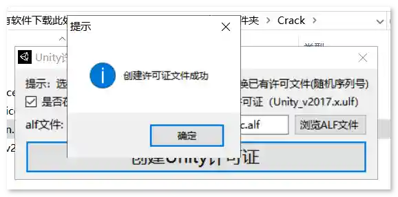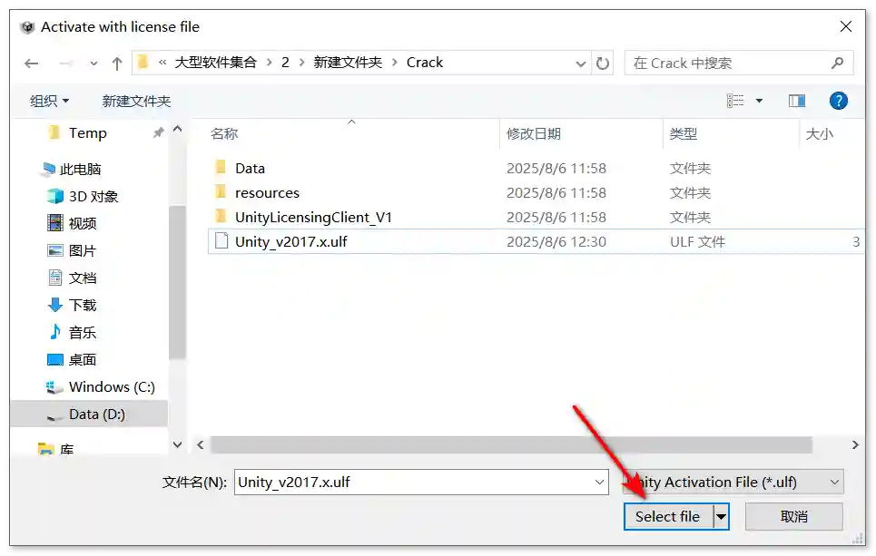 35、打开Crack文件夹,选择【Unity v2017.x.ulf】点击【Select file】