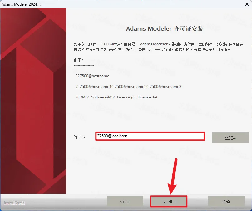 09. 在“许可证”框内输入 27500@localhost,点击【下一步】