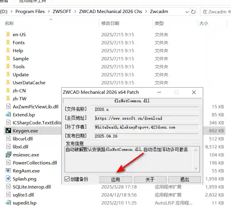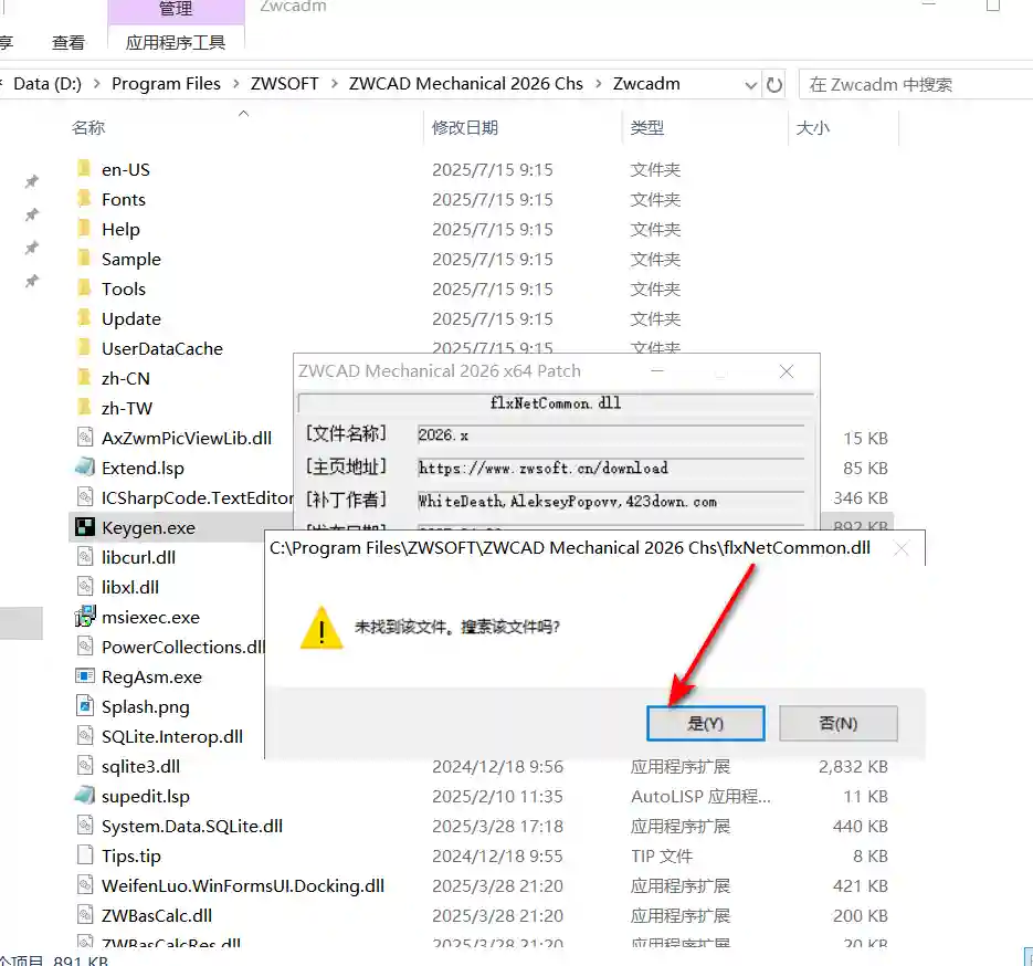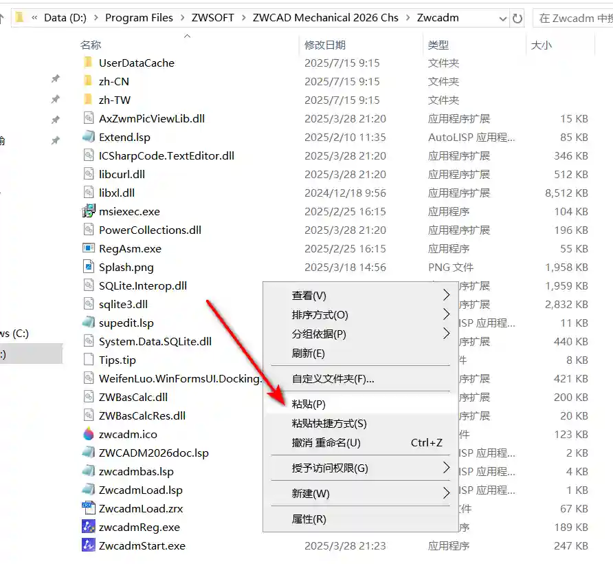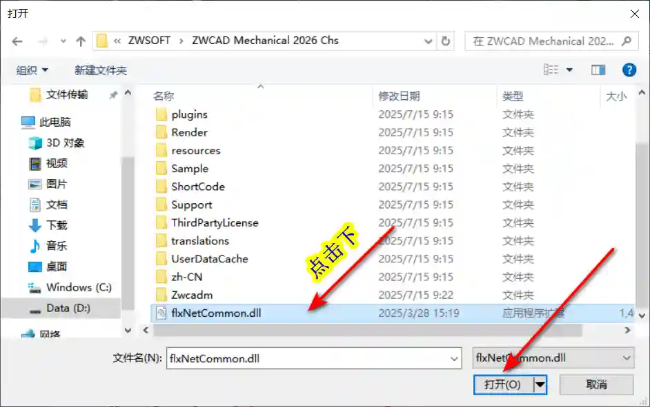 14、浏览至 D:\Program Files\ZWSOFT\ZWCAD Mechanical 2026 Chs 目录,选择 flxNetCommon 文件,点击“打开”。