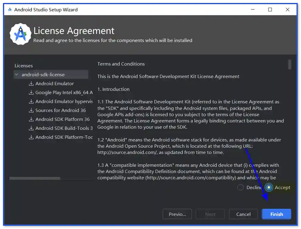 15、根据需求选择 SDK License,勾选 “Accept”,点击 “Finish”