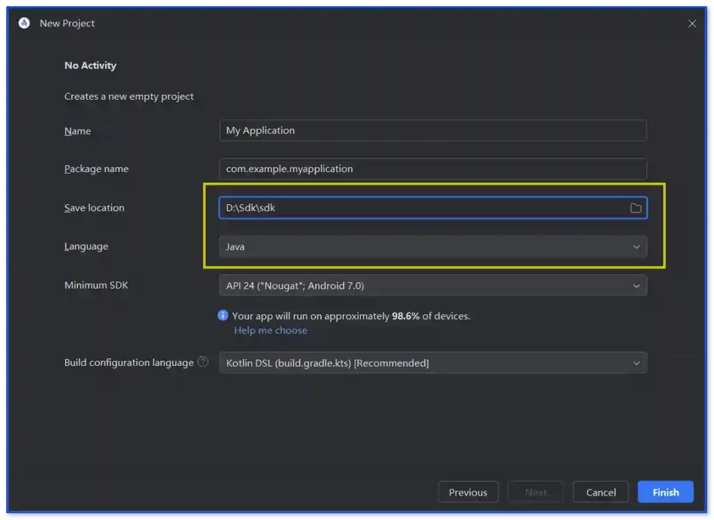 20、设置项目保存路径(必须为空文件夹且无中文),选择开发语言 → 点击 “Finish”