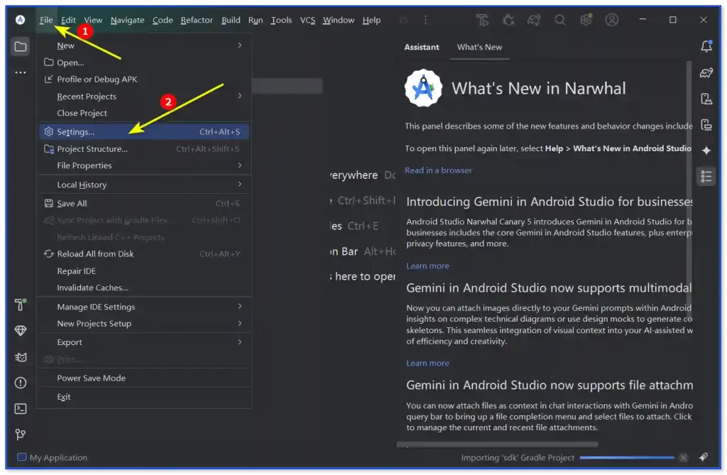 1、点击菜单栏 “File” → 选择 “Settings…”