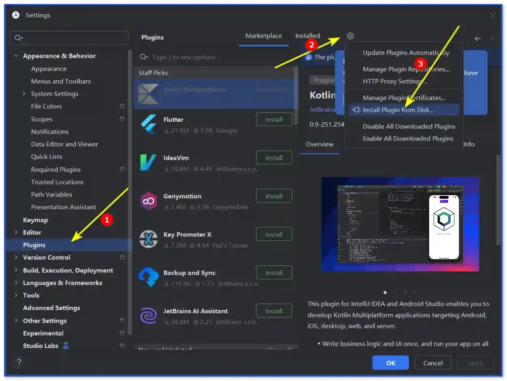 2、进入 “Plugins” → 点击设置图标 → 选择 “Install from Disk…”