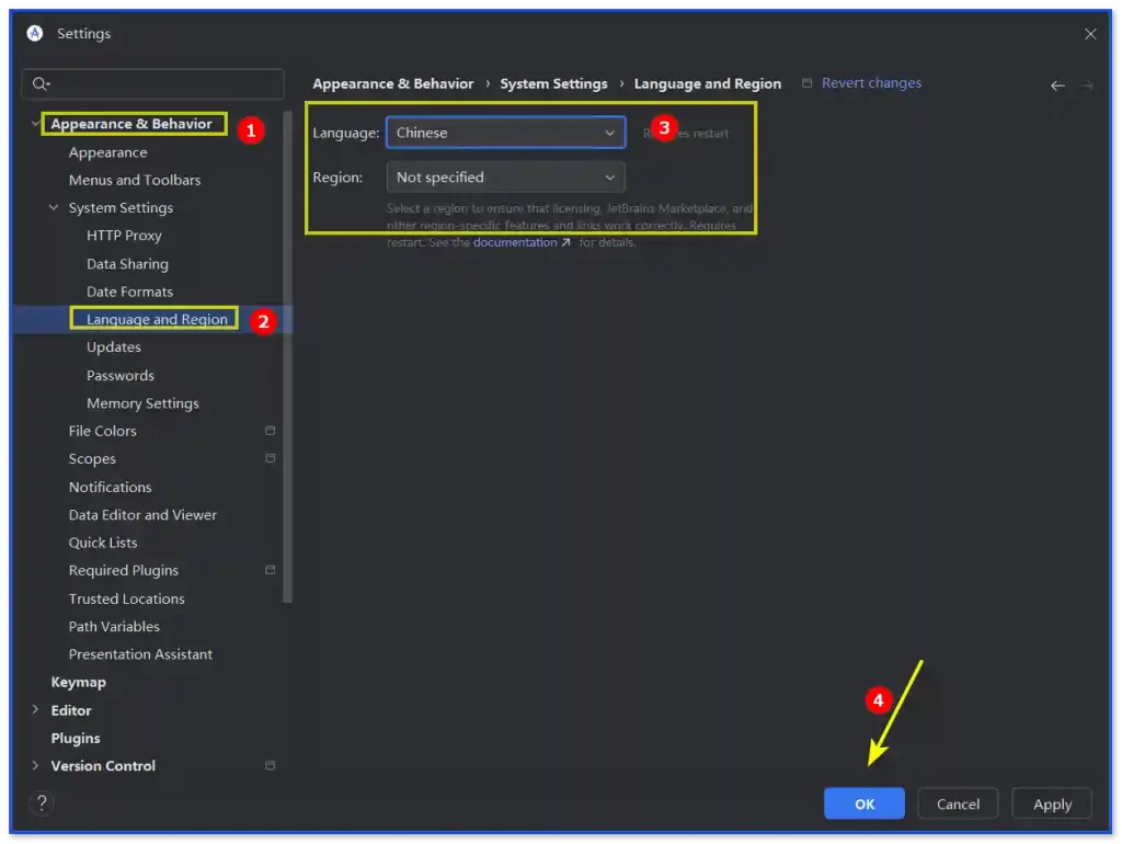 5、展开 “Appearance & Behavior → System Settings” → 进入 “Language and Region”