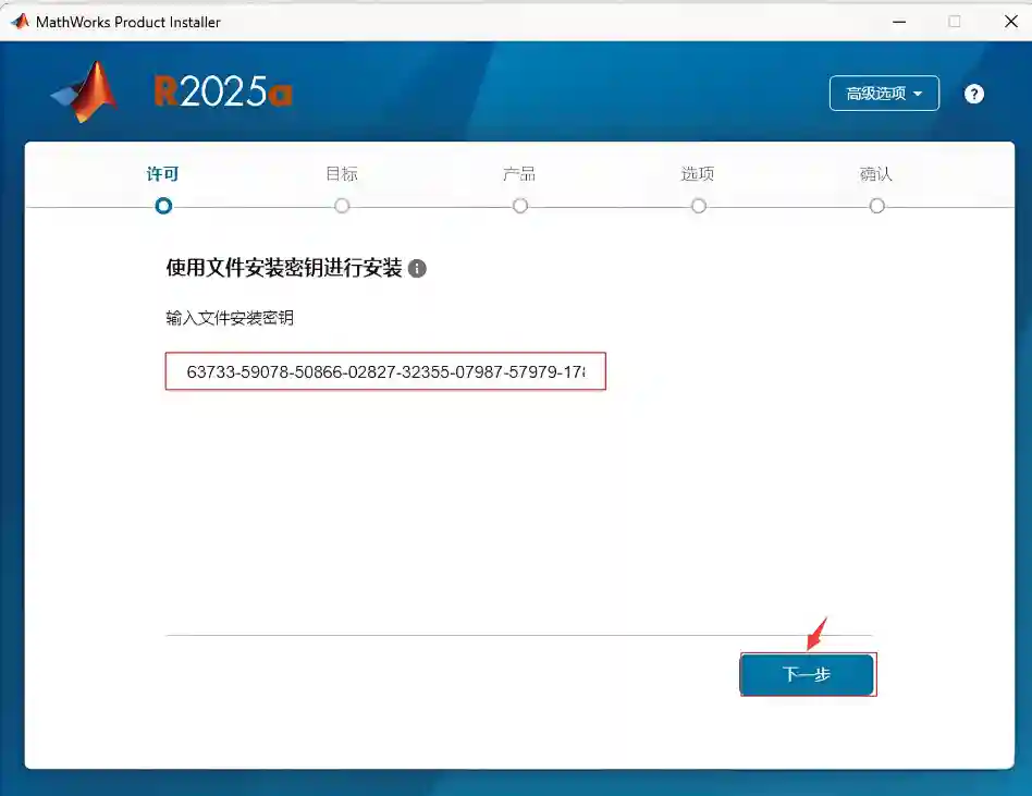 6、输入密钥: 63733-59078-50866-02827-32355-07987-57979-17850-05492-24096-05227-42839-55624-20610-22640-51189 (复制数字即可)